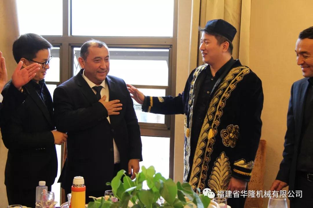 在兩方參觀完生產(chǎn)車間后,華隆機械行地主之誼,熱誠得邀請烏方納沃伊州代表團到冠豪大酒店用餐。烏方納沃伊州市長也表示出了滿滿的誠意,拿出烏茲別克斯坦傳統(tǒng)圓餅形面包與我們分享。并為華隆機械銷售部經(jīng)理披上象征烏茲別克斯坦最高榮譽的傳統(tǒng)服飾。