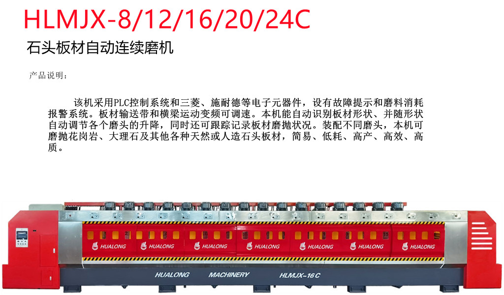 HLMJX-16 型自動(dòng)石材板材連續(xù)拋光機(jī),配備多個(gè)樹脂盤頭和 PLC 控制系統(tǒng),能夠連續(xù)自動(dòng)地對(duì)板材進(jìn)行研磨和拋光,是花崗巖等硬質(zhì)石材表面處理的理想選擇。安裝不同類型的頭,它也非常適合大理石、石英巖和其他石材板材的加工。