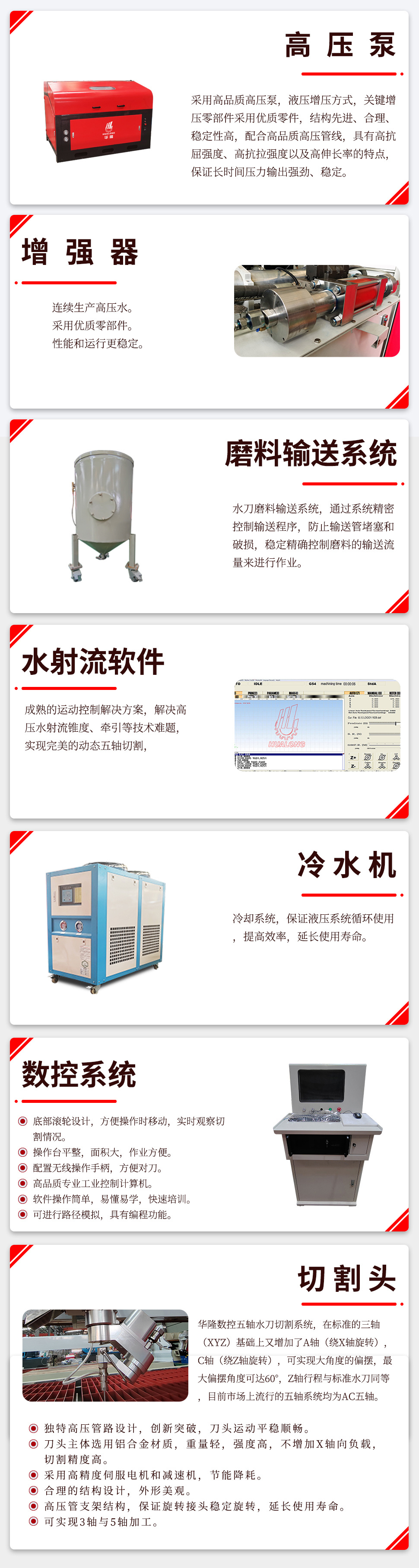 HLRC-4020, which using a very high-pressure jet of water and abrasive (typically garnet) to erode a narrow line in the stock material, is an industrial tool capable for cutting almost any material while maintaining high precision.