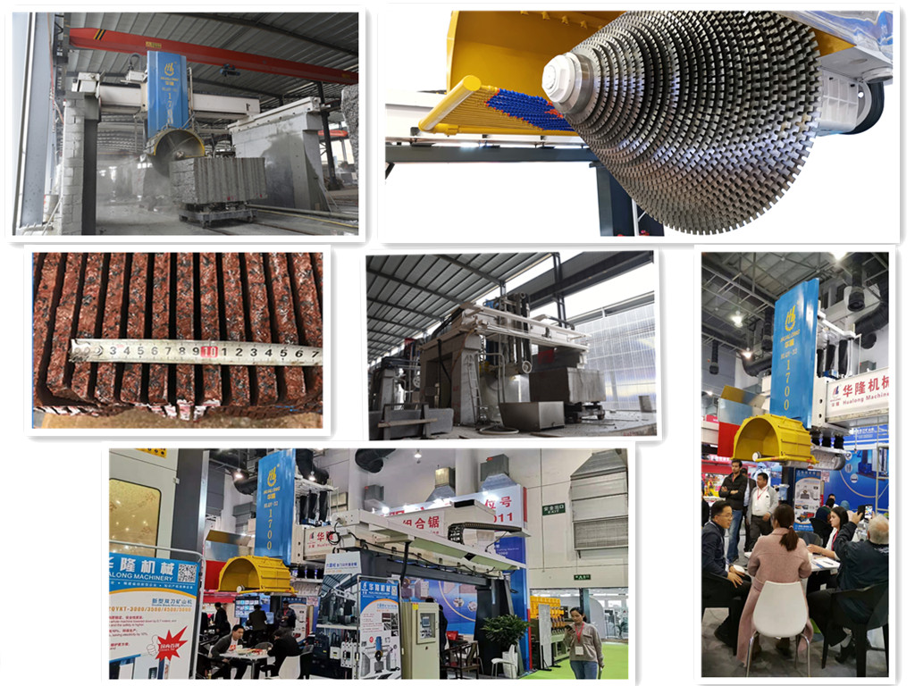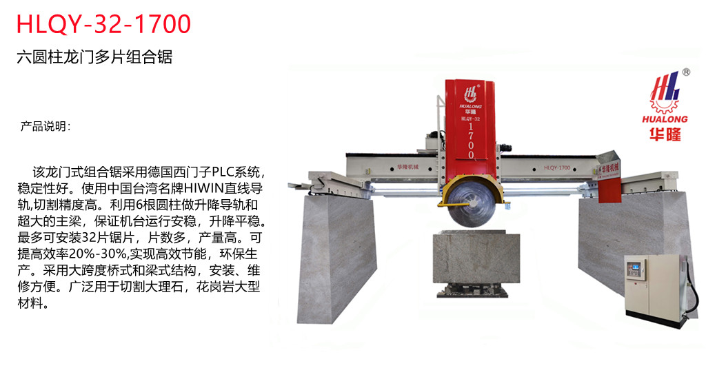 6 Pillars Multi-blade Stone Cutting Machine HLQY-32-1700 is a new developed heavy-duty stone machinery. Equiped with 6 pillars for spindle sliding and 32 pieces of circle blades, it's suitable for cutting granite blocks into slabs high efficiently.